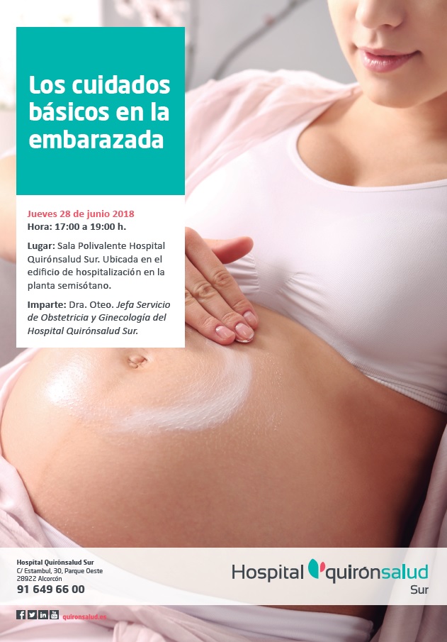 La charla sobre cuidados básicos de la embarazada, que impartirá la Dra. Carmen Oteo, Jefa de Servicio de Obstetricia y Ginecología del Hospital Quirónsalud Sur tendrá lugar el jueves 28 de junio a las 17.00 horas en la Sala Polivalente Hospital Quirónsalud Sur, ubicada en el edificio de hospitalización en la planta semisótano.