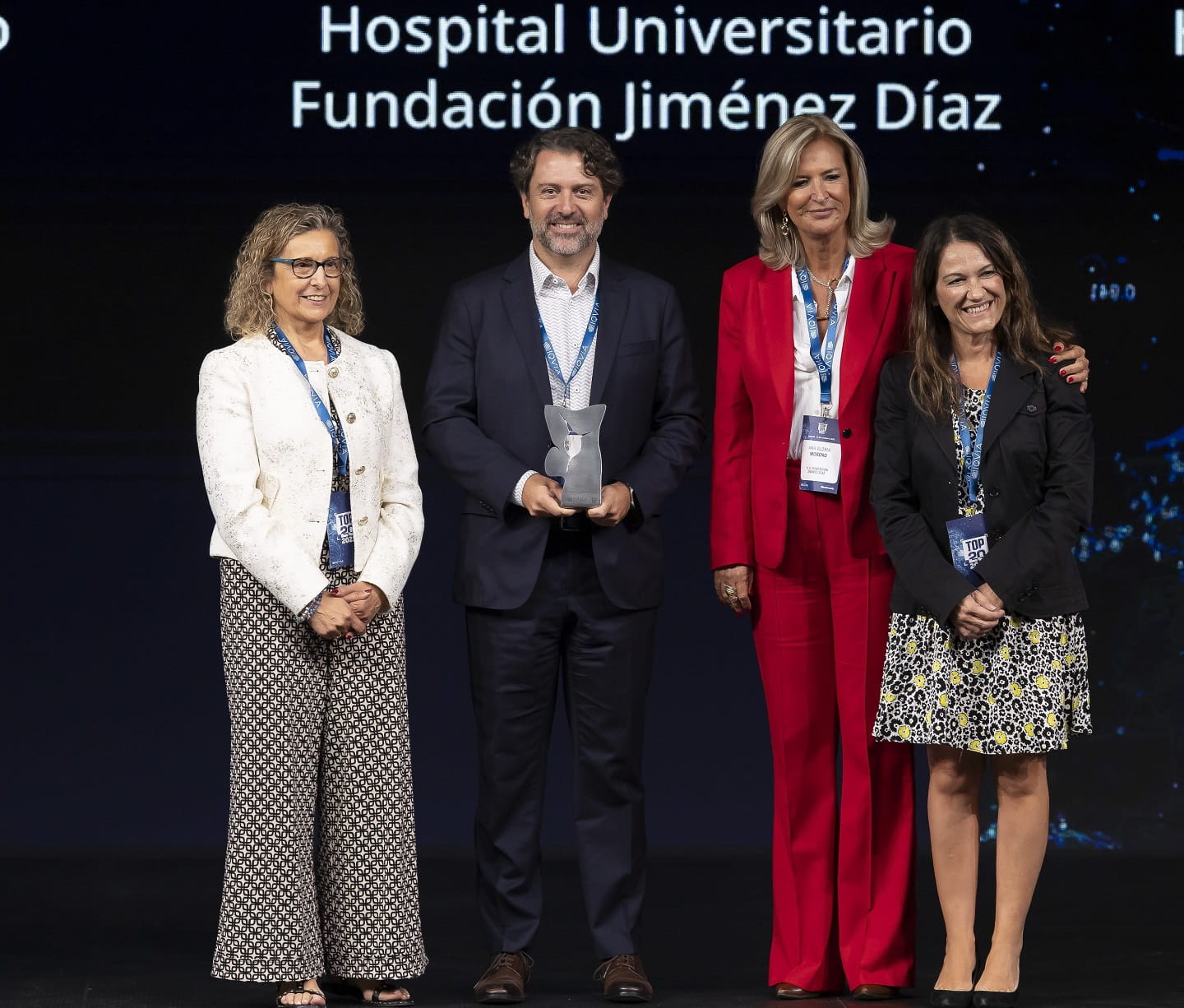 Entre los reconocimientos otorgados a la Fundación Jiménez Díaz, destaca una vez más el Premio Top 20 en la categoría de "Gestión Hospitalaria Global", dentro del grupo de "Hospitales de referencia regional y nacional", que recogieron el Dr. Javier Arcos, gerente del hospital, Ana Posada, gerente adjunta; la Dra. Marta Cremades, directora médica del centro; y Ana Gloria Moreno, directora de Enfermería, de manos de Dña. Laura Gutiérrez, viceconsejera de Sanidad de la Comunidad de Madrid.