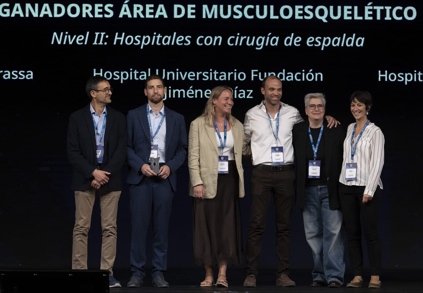 Por su parte, el grupo de profesionales formado por el Dr. Carmelo Fernández, jefe del Departamento de Rehabilitación y Medicina Física; Silvia Calvo y Maria Luisa Seijas, coordinadora y supervisora de Enfermería, respectivamente, de este servicio; el Dr. Javier Cervera, jefe asociado del Servicio de Cirugía Ortopédica y Traumatología; y Manuel Lavado y Coloma Pinilla, coordinador y supervisora de Enfermería, respectivamente, de este último servicio, recibieron el galardón Top 20 en el Área de "Músculo-esquelético" en el nivel de "Hospitales con cirugía de espalda".