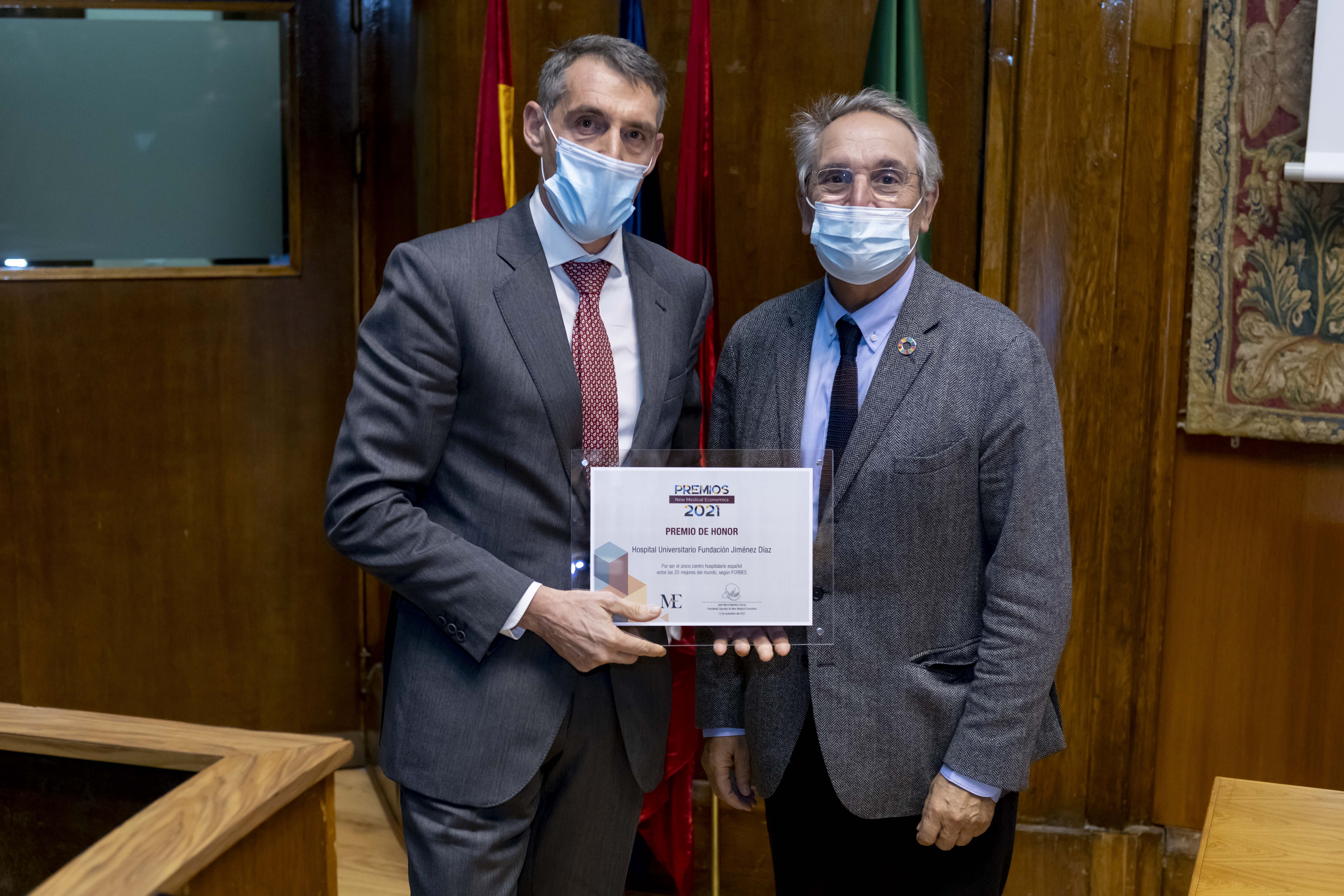 El premio, que recogió el gerente de la Fundación Jiménez Díaz, Juan Antonio Álvaro de la Parra, de manos del director general de Ordenación Profesional del Ministerio de Sanidad, Vicenç Martínez Ibáñez, en un acto celebrado en el Aula Magna del propio hospital y presidido por José María Martínez García, director de Medical Economics, reconoce así la excelencia en la trayectoria y trabajo del centro madrileño, que le ha hecho valedor, entre otros hitos, de ser el único hospitalario español entre los 20 mejores del mundo, según la revista Forbes.