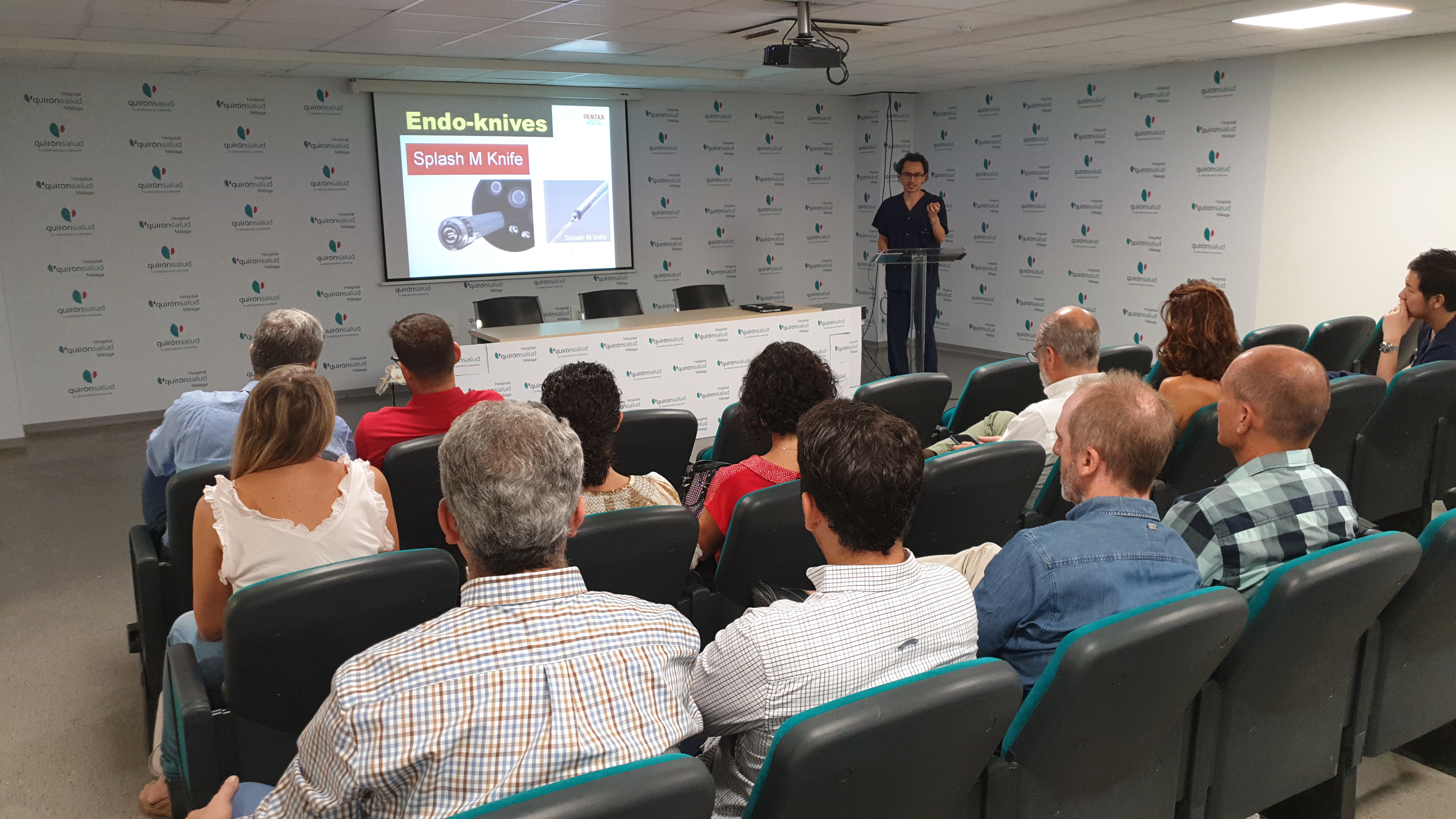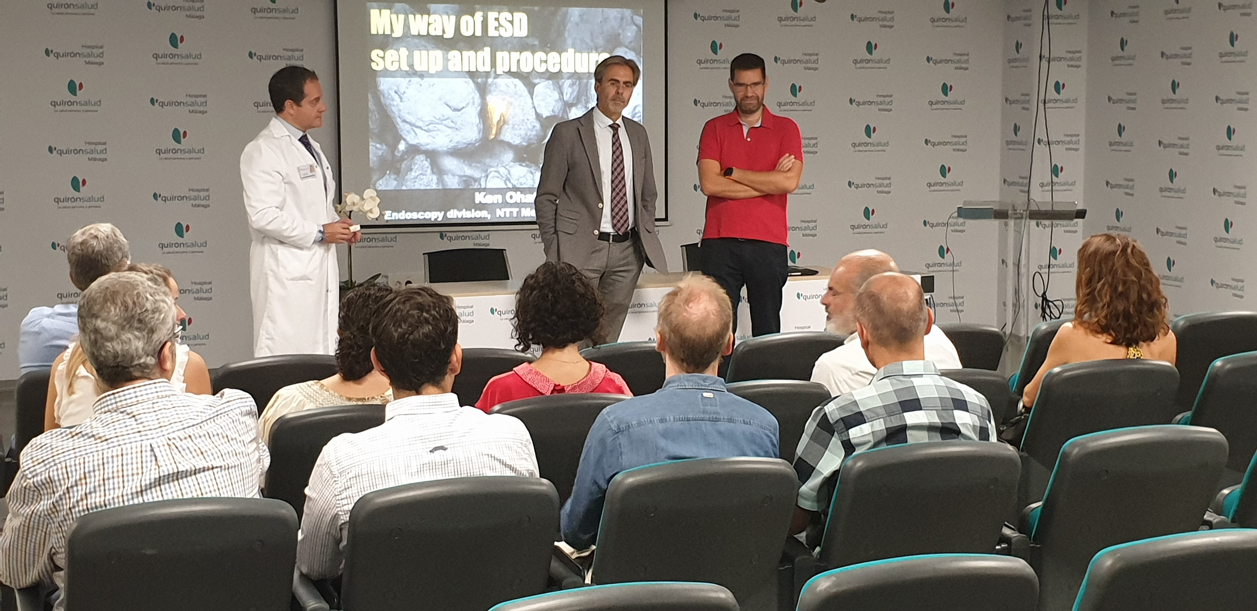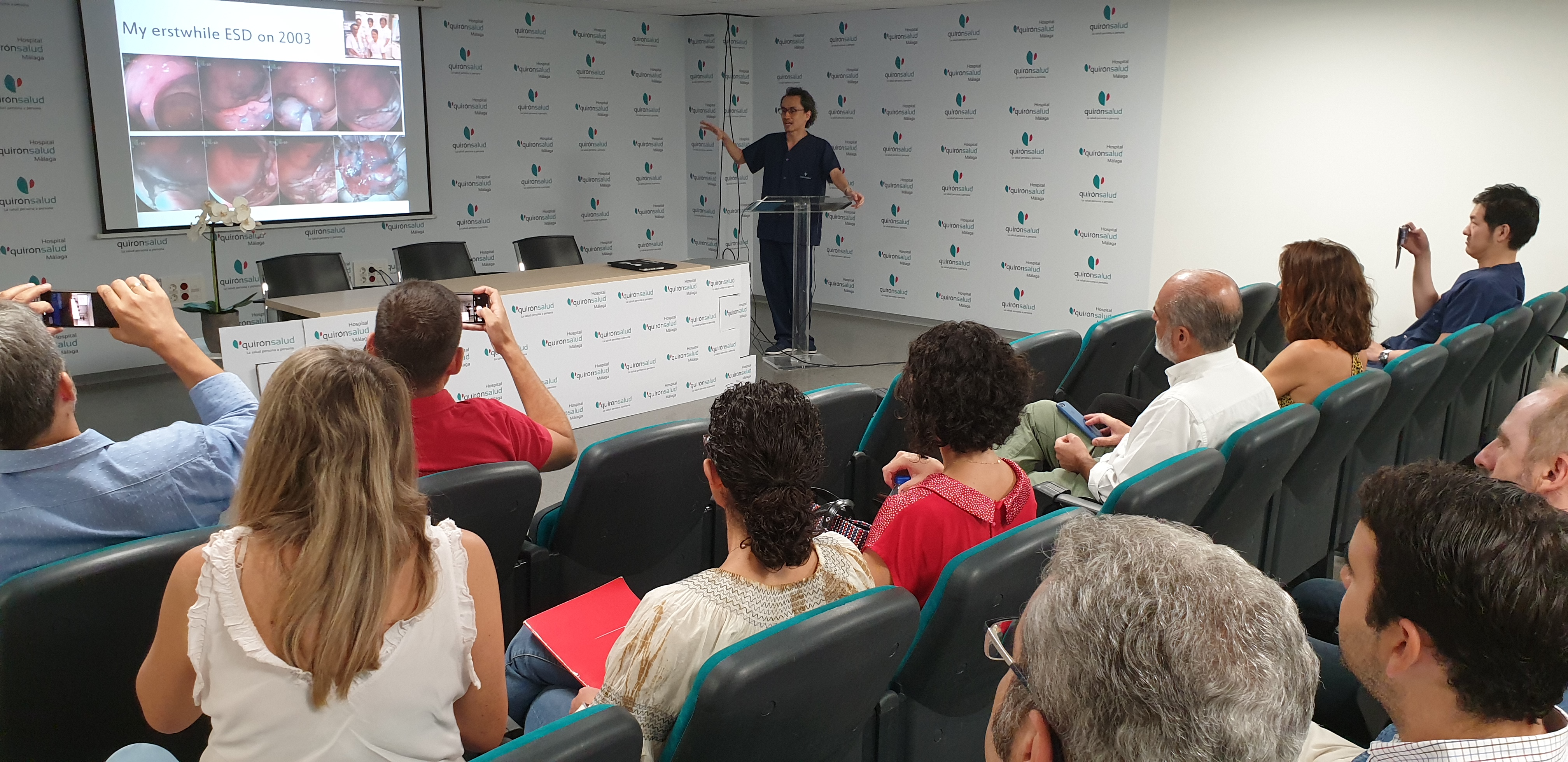 La presentación de la jornada ha tenido lugar el salón de actos por parte de los doctores Tomás Urda y Miguel Marcos, director gerente y director médico del Hospital Quirónsalud Málaga, respectivamente, junto al doctor Pedro Rosón, jefe del servicio de Aparato Digestivo y de la Unidad de Endoscopia Digestiva Avanzada. Tras la presentación, y ya en la Sala de Endoscopias, el doctor Pedro Rosón ha contado con la colaboración del doctor Ken Ohata, del Hospital NTT Medical Center de Tokyo, un referente a nivel mundial en este tipo de técnicas. Durante la masterclass han realizado tres intervenciones en directo de Disección Submucosa Avanzada bajo la atenta mirada de todos los asistentes.