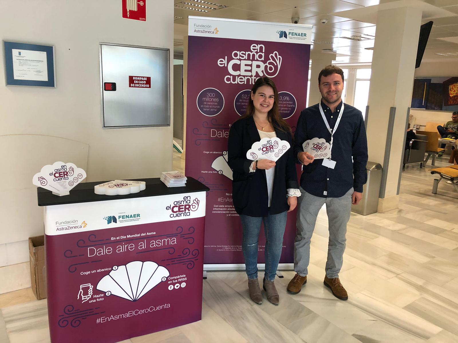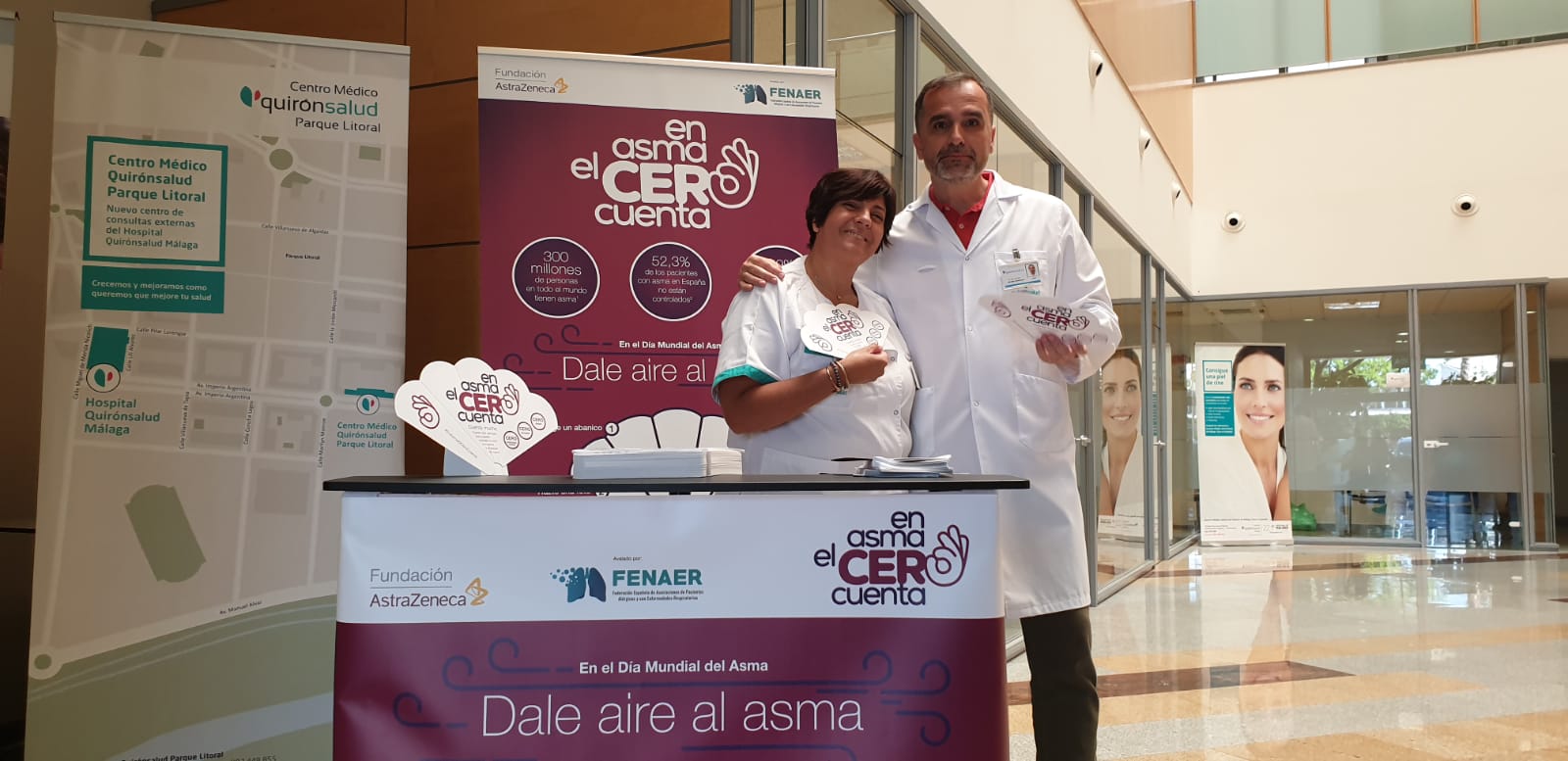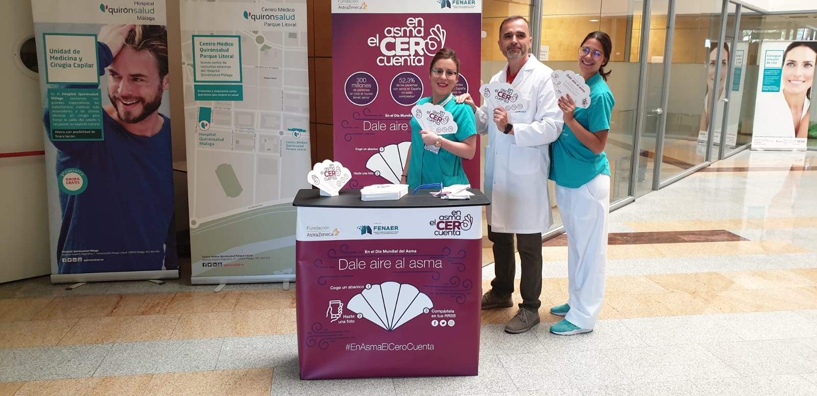 Con motivo del Día Mundial del Asma, que se celebra el 7 de mayo, los Hospitales Quirónsalud Málaga y Marbella en colaboración a la Fundación AstraZeneca participan en la campaña #EnAsmaElCeroCuenta. En este sentido, ambos Hospitales han ubicado en su entrada principal un stand en el que han entragado pai-pais y folletos informativos con pautas y consejos para concienciar a la población sobre el asma y sus riesgos. Además, se ha animado a los interesados a hacerse una foto y compartirla en sus perfiles de Twitter, Facebook e Instagram con el hashtag #EnAsmaElCeroCuenta y lanzar un mensaje de apoyo a los miles de pacientes que sufren esta patología. La iniciativa, avalada por la Federación Española de Asociaciones de Pacientes Alérgicos y con Enfermedades Respiratorias (FENAER), pretende concienciar a la población sobre esta enfermedad, de gran prevalencia en nuestro país.