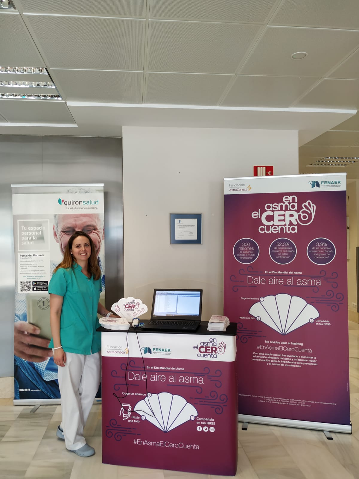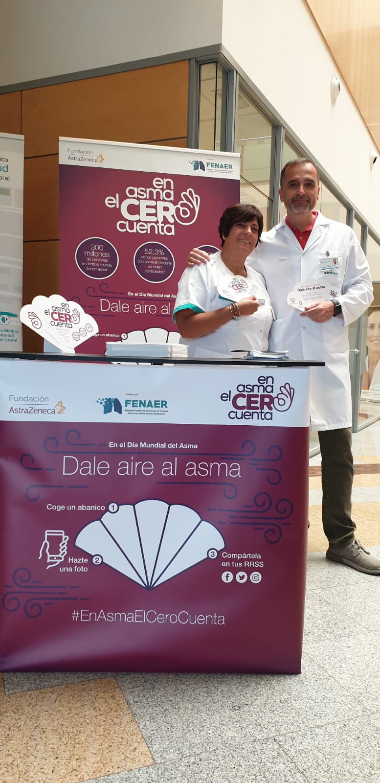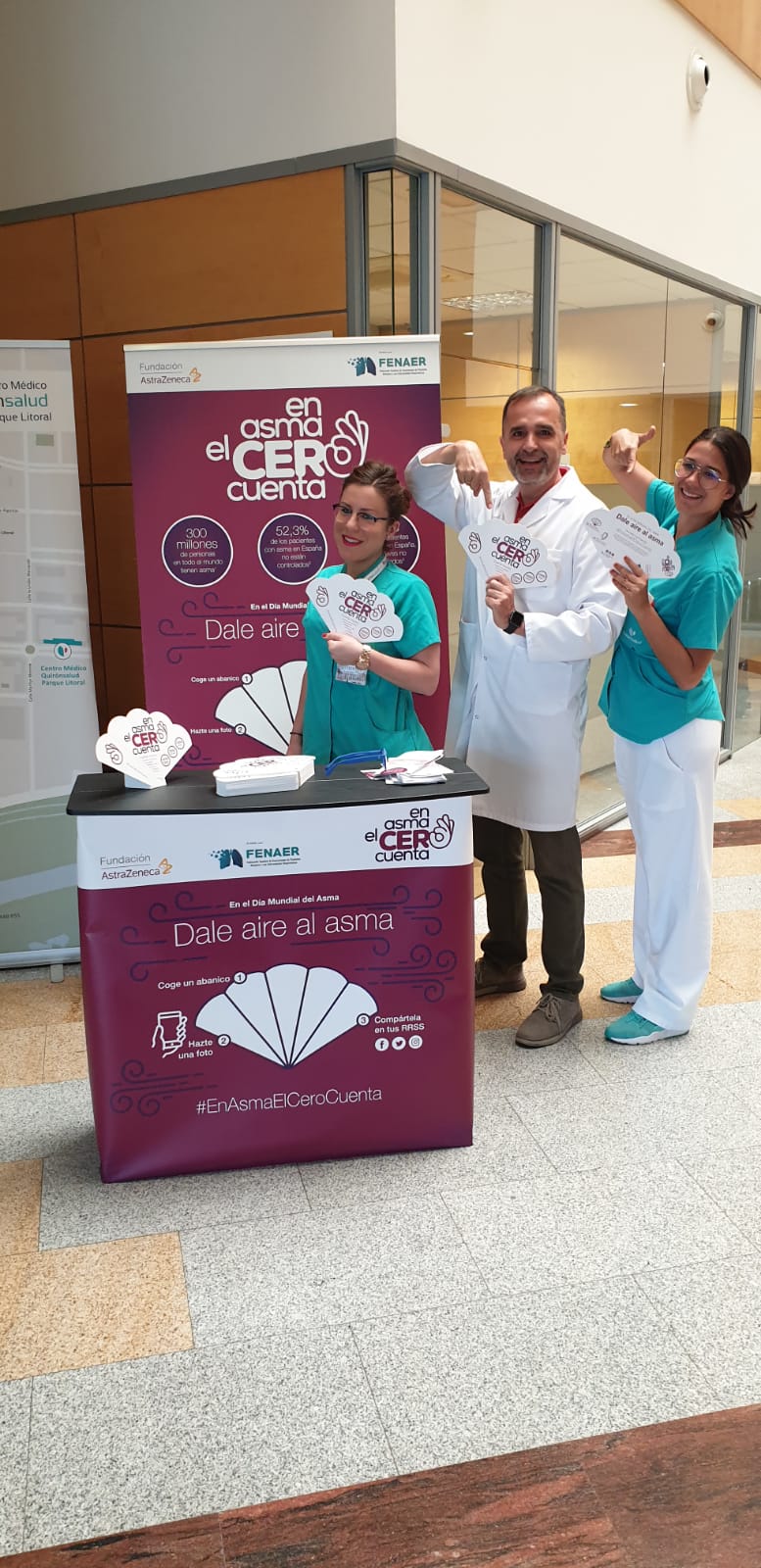 Con motivo del Día Mundial del Asma, que se celebra el 7 de mayo, los Hospitales Quirónsalud Málaga y Marbella en colaboración a la Fundación AstraZeneca participan en la campaña #EnAsmaElCeroCuenta. En este sentido, ambos Hospitales han ubicado en su entrada principal un stand en el que han entragado pai-pais y folletos informativos con pautas y consejos para concienciar a la población sobre el asma y sus riesgos. Además, se ha animado a los interesados a hacerse una foto y compartirla en sus perfiles de Twitter, Facebook e Instagram con el hashtag #EnAsmaElCeroCuenta y lanzar un mensaje de apoyo a los miles de pacientes que sufren esta patología. La iniciativa, avalada por la Federación Española de Asociaciones de Pacientes Alérgicos y con Enfermedades Respiratorias (FENAER), pretende concienciar a la población sobre esta enfermedad, de gran prevalencia en nuestro país.