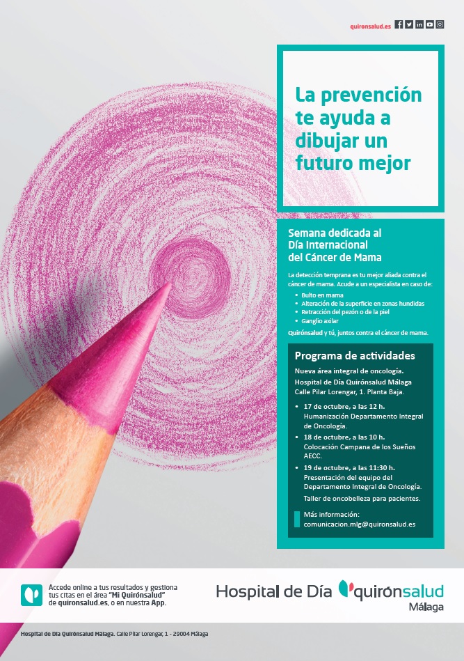 El Hospital Quirónsalud Málaga conmemora el próximo Día Internacional del Cáncer de Mama con distintas actividades la próxima semana, abiertas al público general y especialmente dedicadas a las pacientes, con el fin de ofrecer apoyo e información necesaria, así como fomentar la prevención y el diagnóstico precoz tan fundamental para la supervivencia.