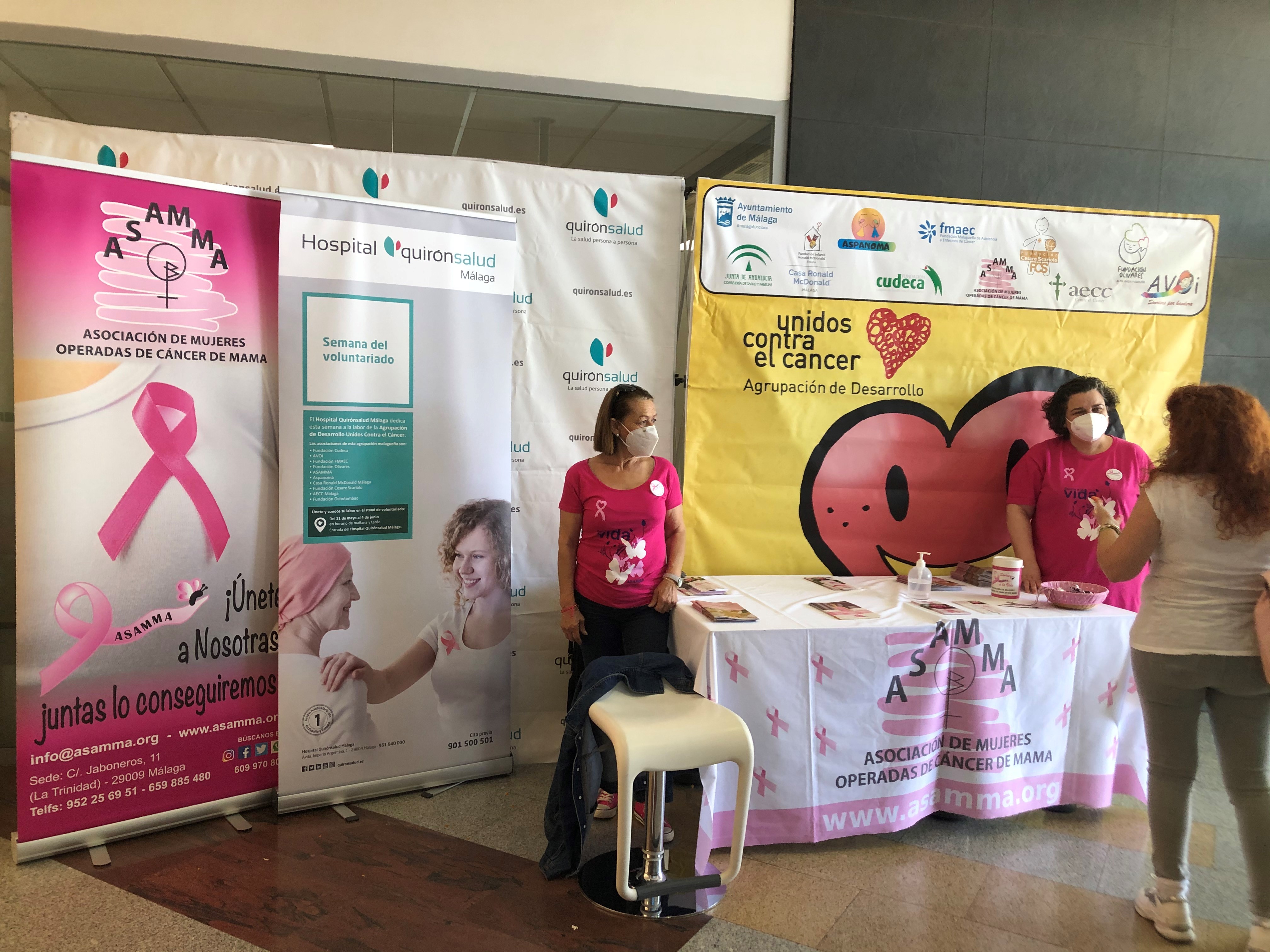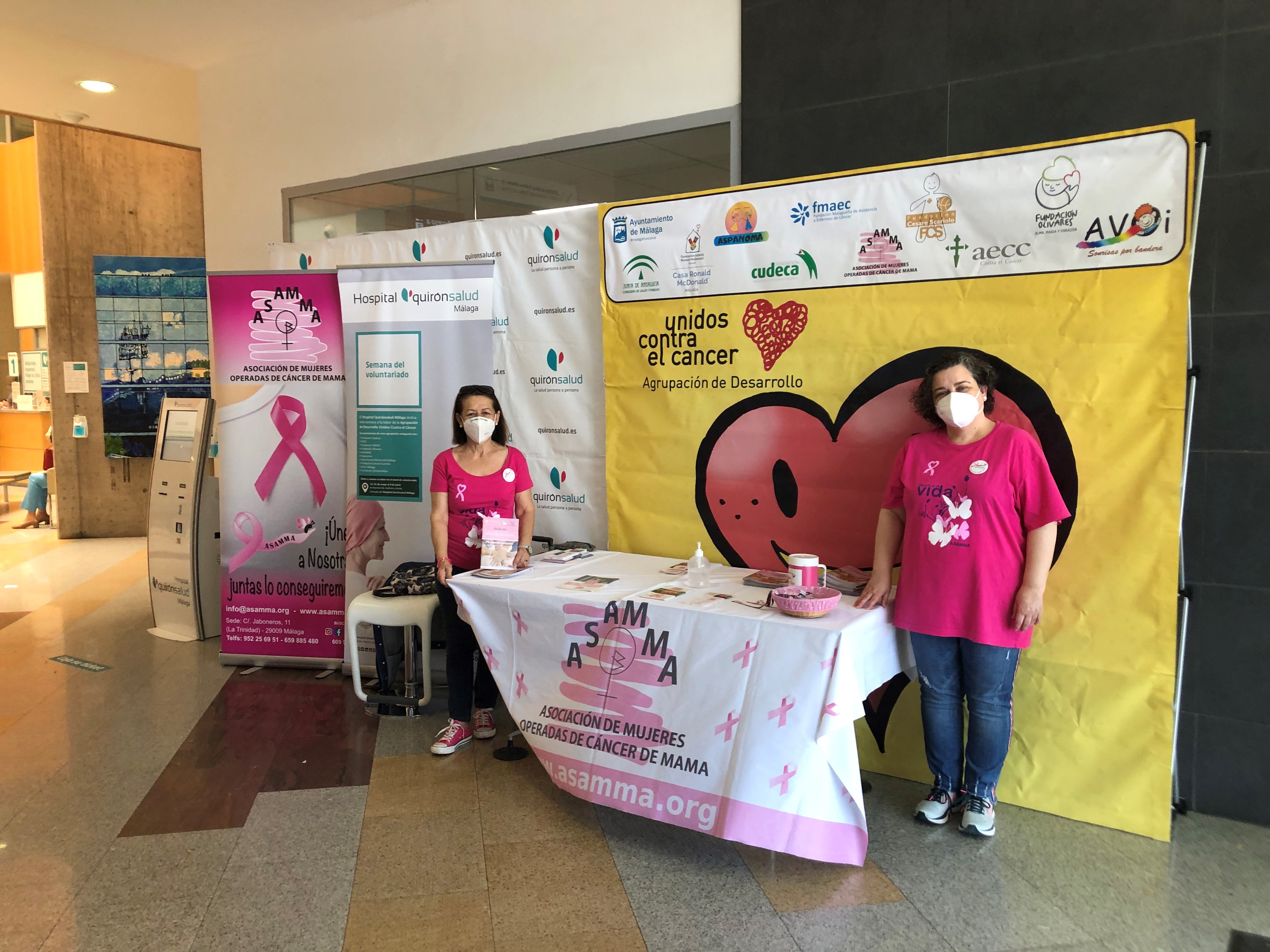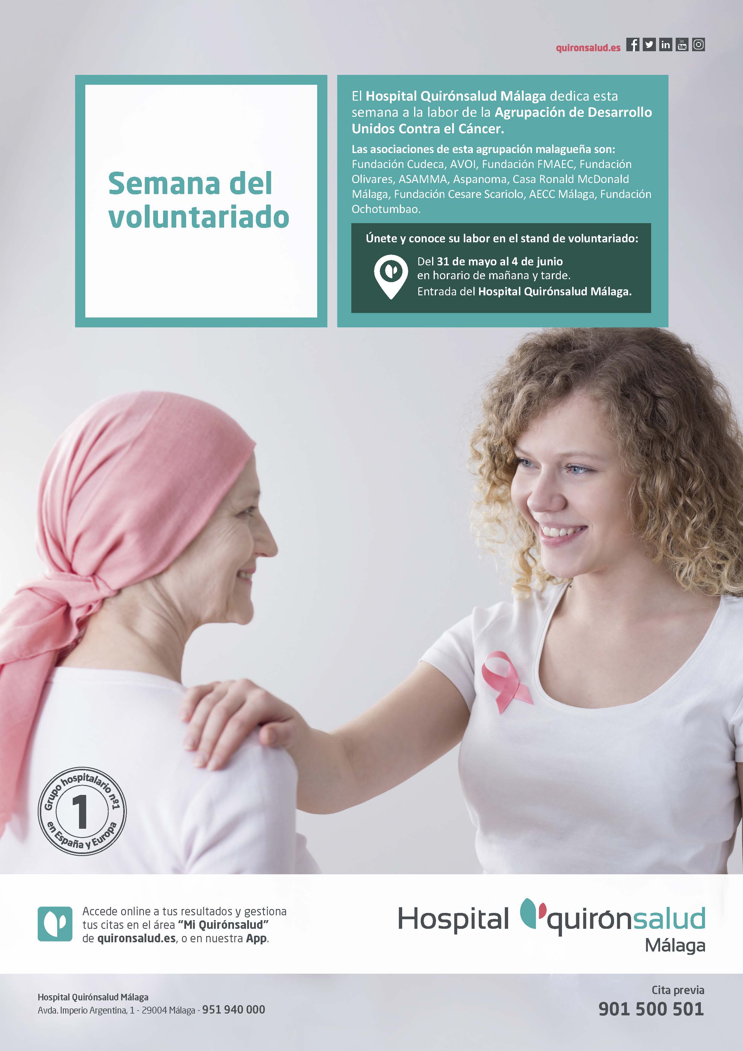 El Hospital Quirónsalud Málaga dedica esta semana a la labor de voluntariado de la Agrupación de Desarrollo Unidos Contra el Cáncer, dando voz y visibilidad a las 10 entidades sociales que la forman con un stand habilitado del 31 de mayo al 4 de junio en la entrada del centro hospitalario (Avenida Imperio Argentina, 1), en horario de mañana y tarde.