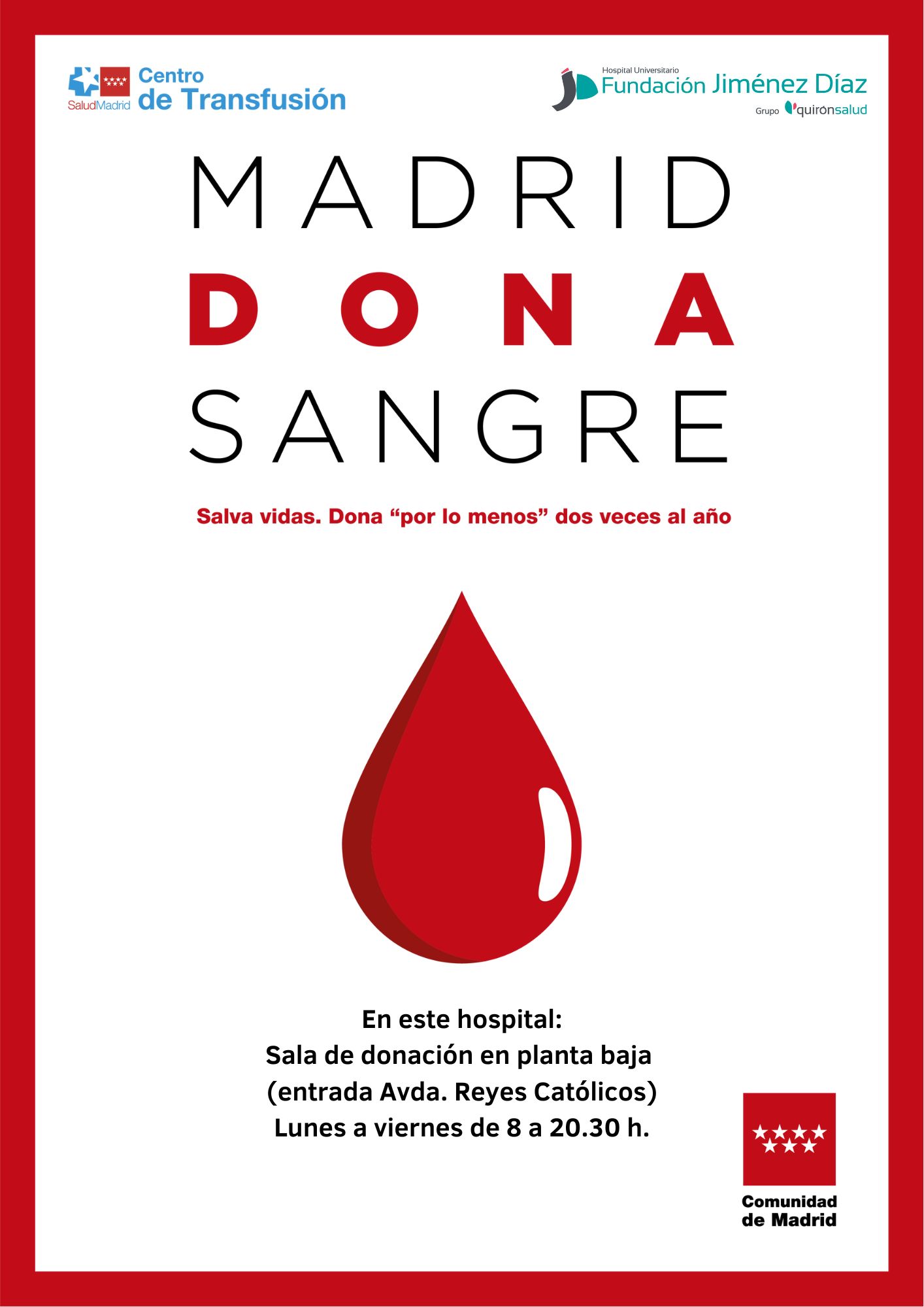 El Hospital Universitario Fundación Jiménez Díaz se suma al Maratón simultáneo de donación "Madrid Dona Sangre", que convoca y coordina esta semana el Centro de Transfusión de la Comunidad de Madrid con un mensaje claro y directo para la población: "Salva vidas. Dona, por lo menos, dos veces al año". Esta iniciativa, que arranca hoy, 9 de enero, y se extenderá hasta el sábado día 14, tiene como objetivo reforzar las reservas de sangre de la región, que están deficitarias tras las fiestas navideñas, para hacer frente a las necesidades hospitalarias de las próximas semanas y meses.