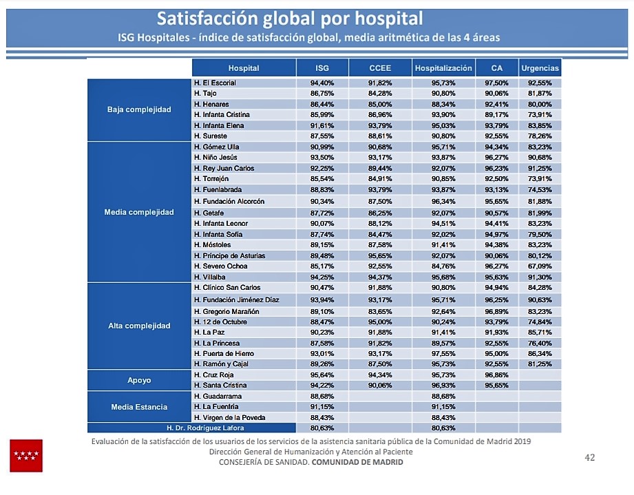 , perteneciente a la red sanitaria pública de la Comunidad de Madrid, vuelve a liderar el ranking de hospitales madrileños de media complejidad con mayor Índice de Satisfacción General (ISG), con un 94,25 por ciento, según los resultados correspondientes al pasado ejercicio de la Encuesta anual de Satisfacción, que la Consejería de Sanidad de la Comunidad de Madrid elabora para evaluar la percepción de los ciudadanos de los hospitales de la red pública autonómica, y que se dieron a conocer el pasado viernes.