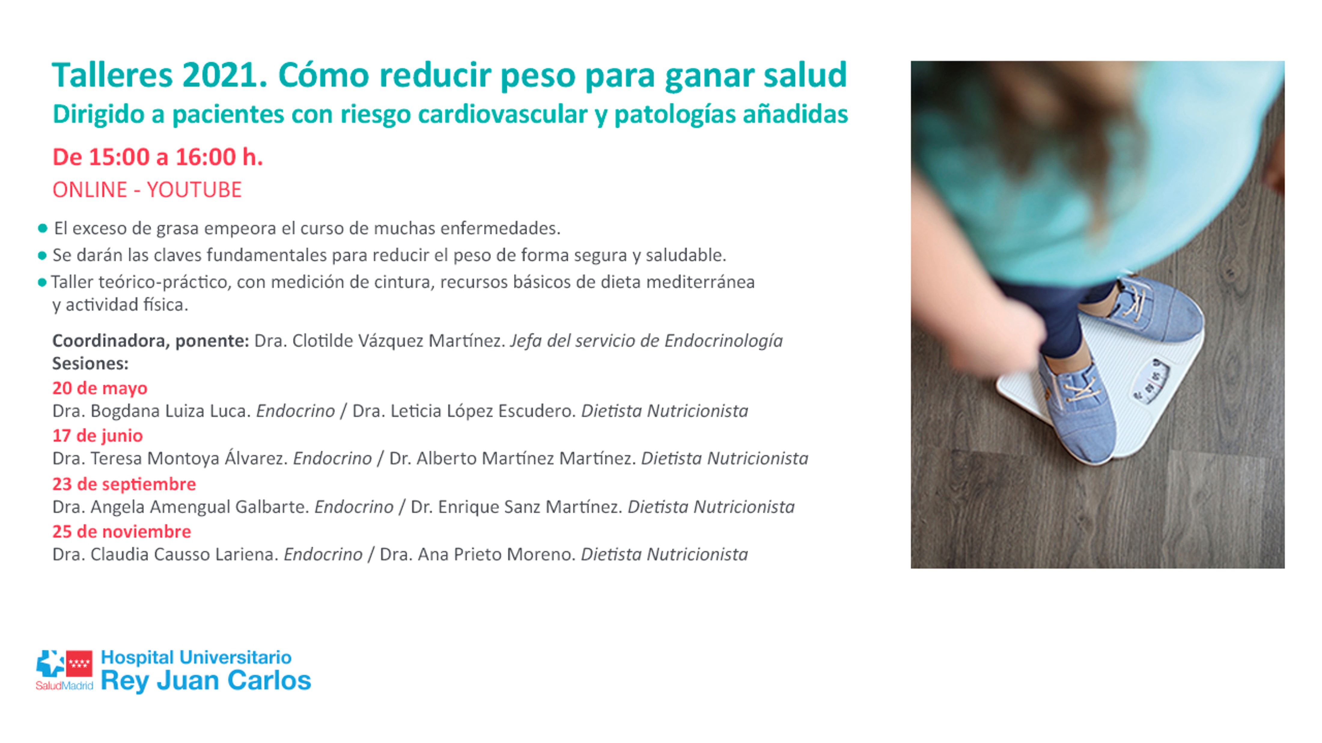 a través de Youtube, y de la que está prevista una última cita el próximo mes de noviembre, está dirigida a pacientes con riesgo cardiovascular, un índice de masa corporal (IMC) mayor de 30 y alguna patología añadida en la que la pérdida supone un beneficio directo.